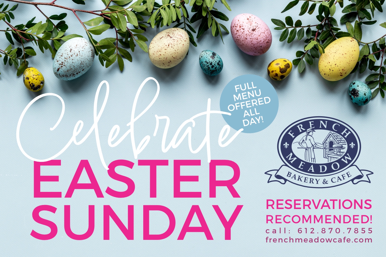 Join us Easter Sunday at French Meadow. We’re open 7:30 AM – 8:00 PM with our full menu available all day—breakfast, brunch, lunch, dinner, and dessert. Reservations are now open and highly recommended. Click HERE to reserve your table today.